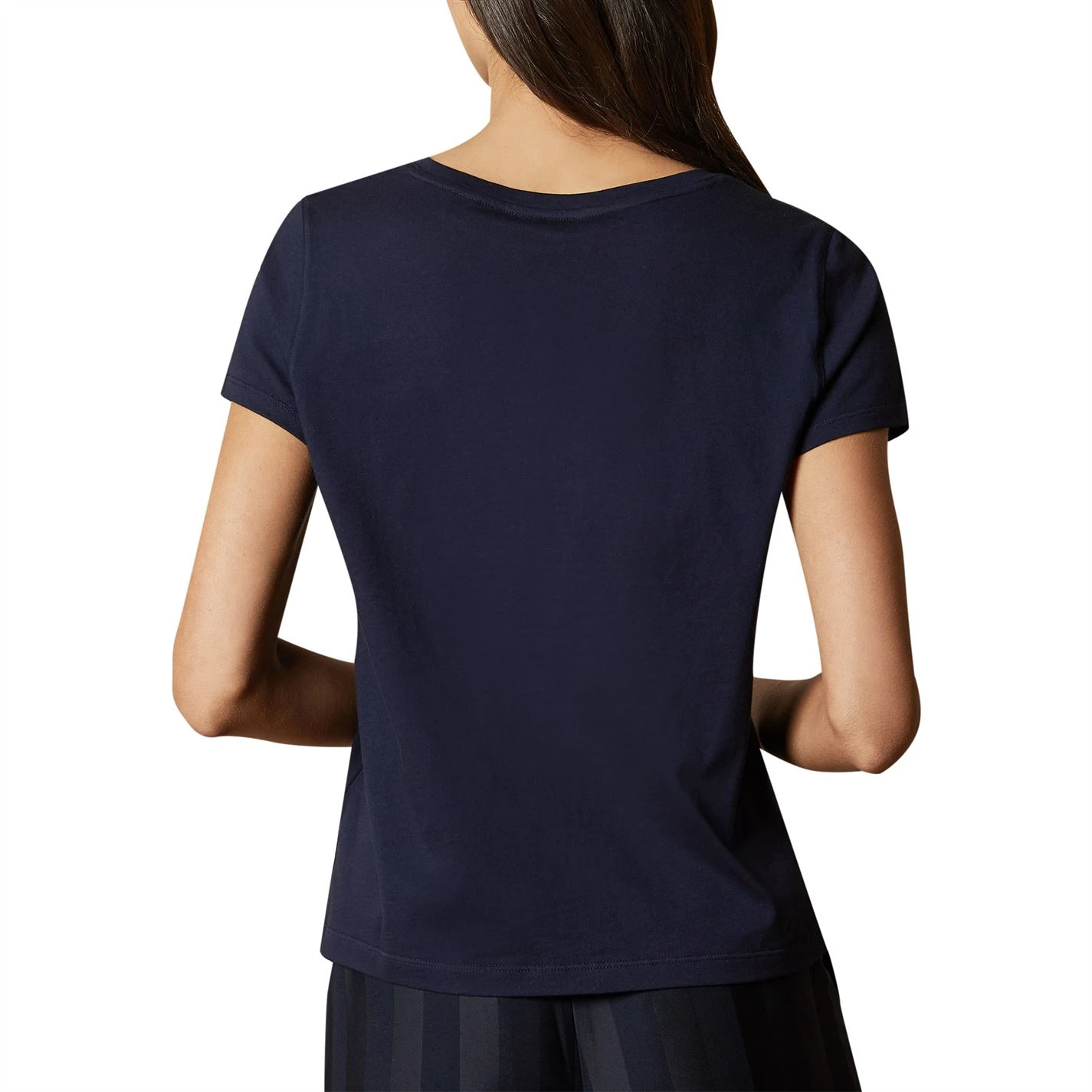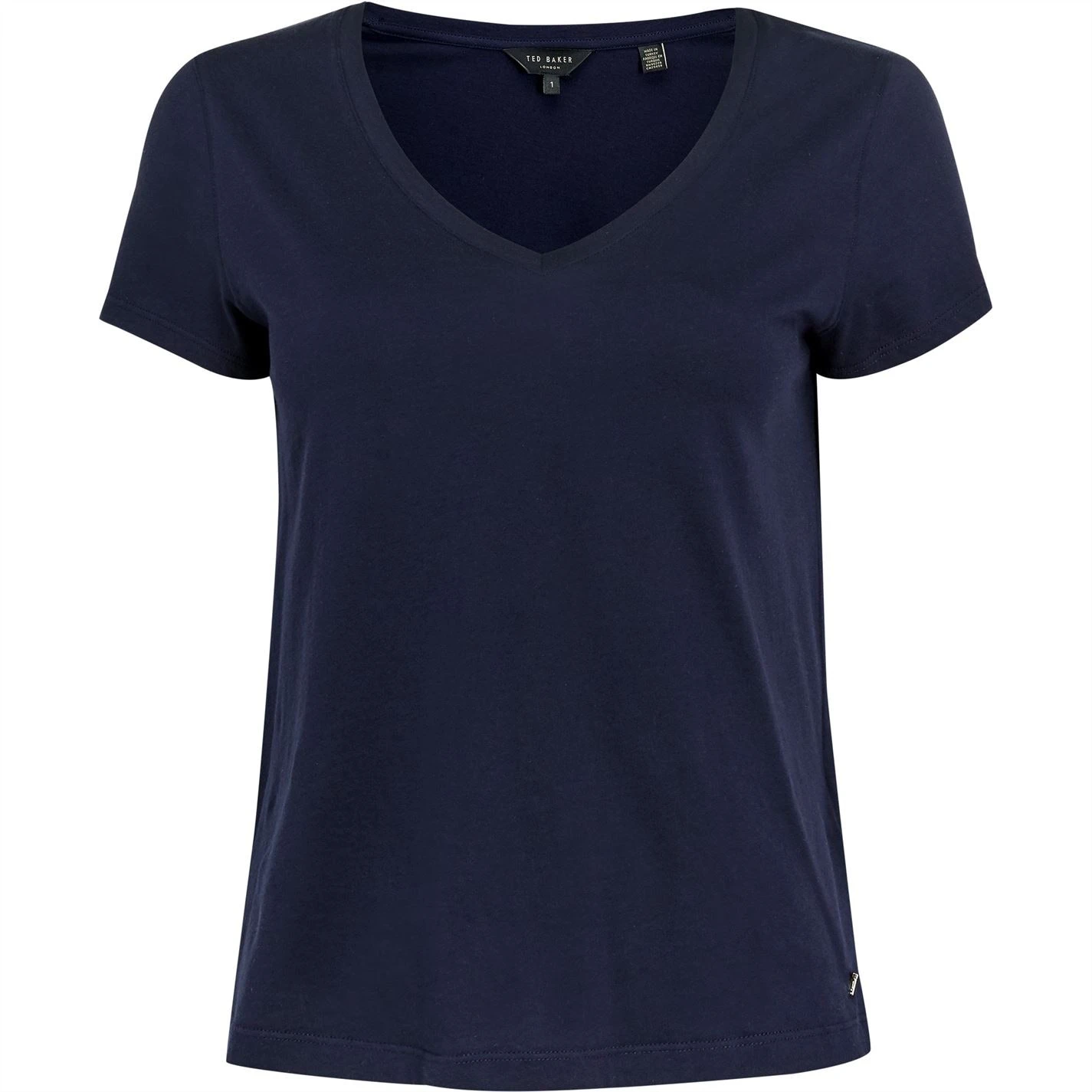 Elevate your collection with this Ted Baker Emyila V T Shirt. Crafted with short sleeves and a ribbed V neckline for a classic look, it features elasticated hems for a comfortable fit. This t shirt is a solid colouring throughout with a signature logo and is complete with Ted Baker branding.