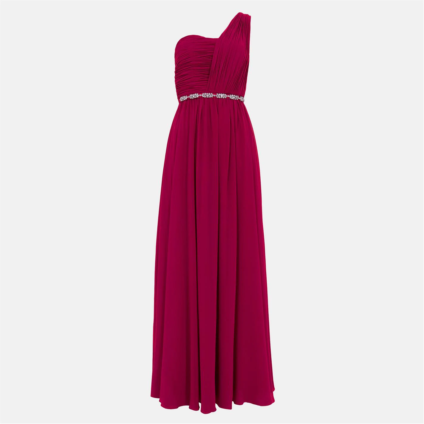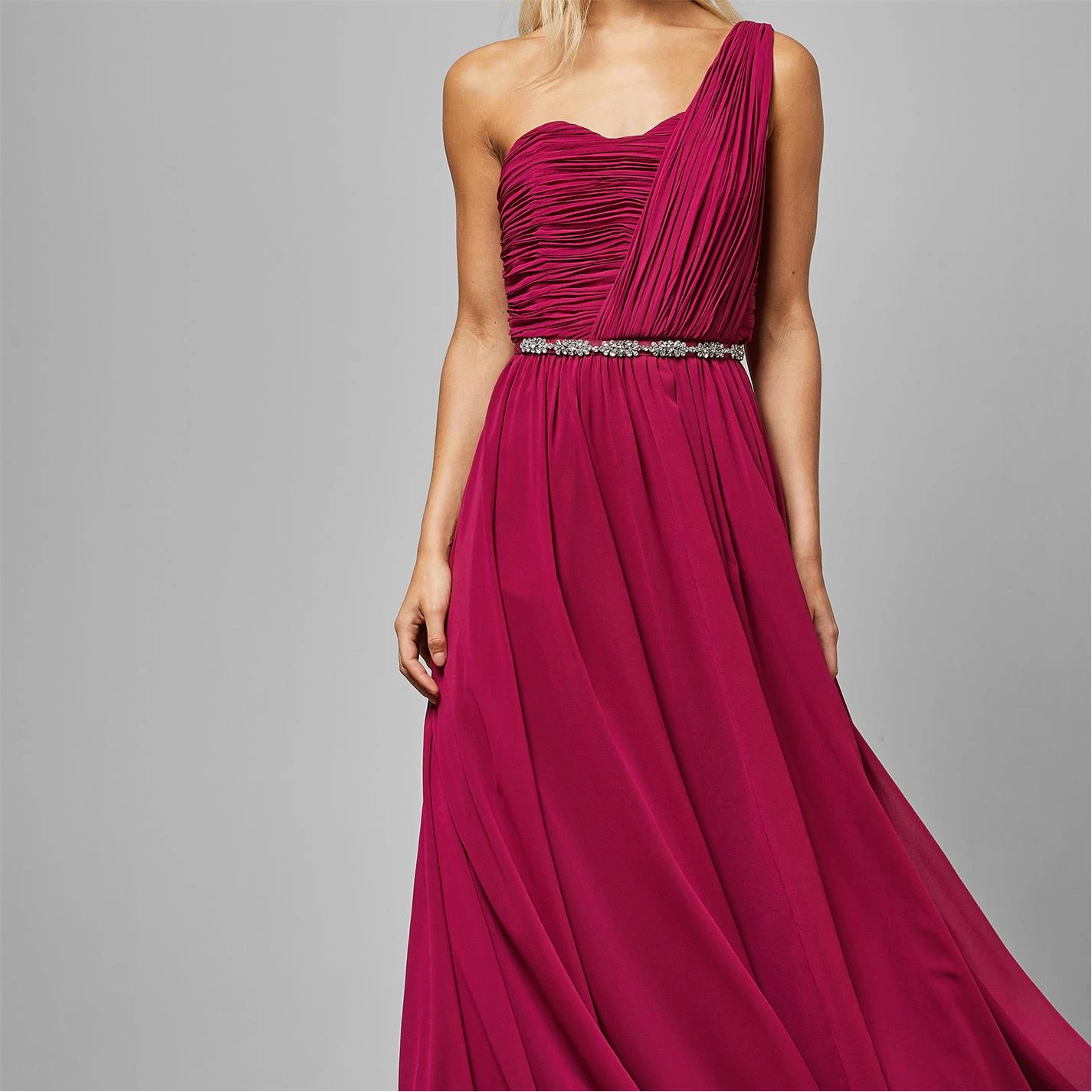 Add some glitz and glamour to your occasion wear with the Ted Baker Finella Maxi Dress. Designed with a gathered waistline adorned with a sparkling gem belt, the one shoulder construction adds an immediate modern appeal. With the floaty maxi length making the dress perfect for bridesmaids or evening balls, the solid block colouring provides a timeless touch.