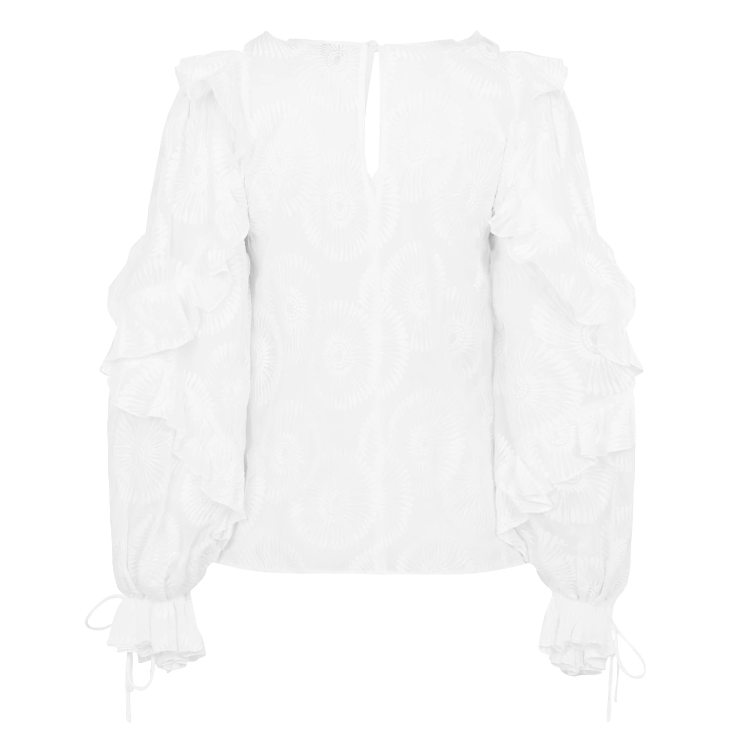 With a feminine allure, the Janeio Ruffle Top brought to you by Ted Baker has been crafted from from a lightweight Polyester fabrication boasting tonal embroidery throughout for a summer ready aesthetic. With double lining to the front and a sheer fabrication at the rear, this top styles a v-neckline, long sleeves with drawstring cuffs and ruffle details all-over. Pair yours with leather-look trousers and mules for any evening occasion.