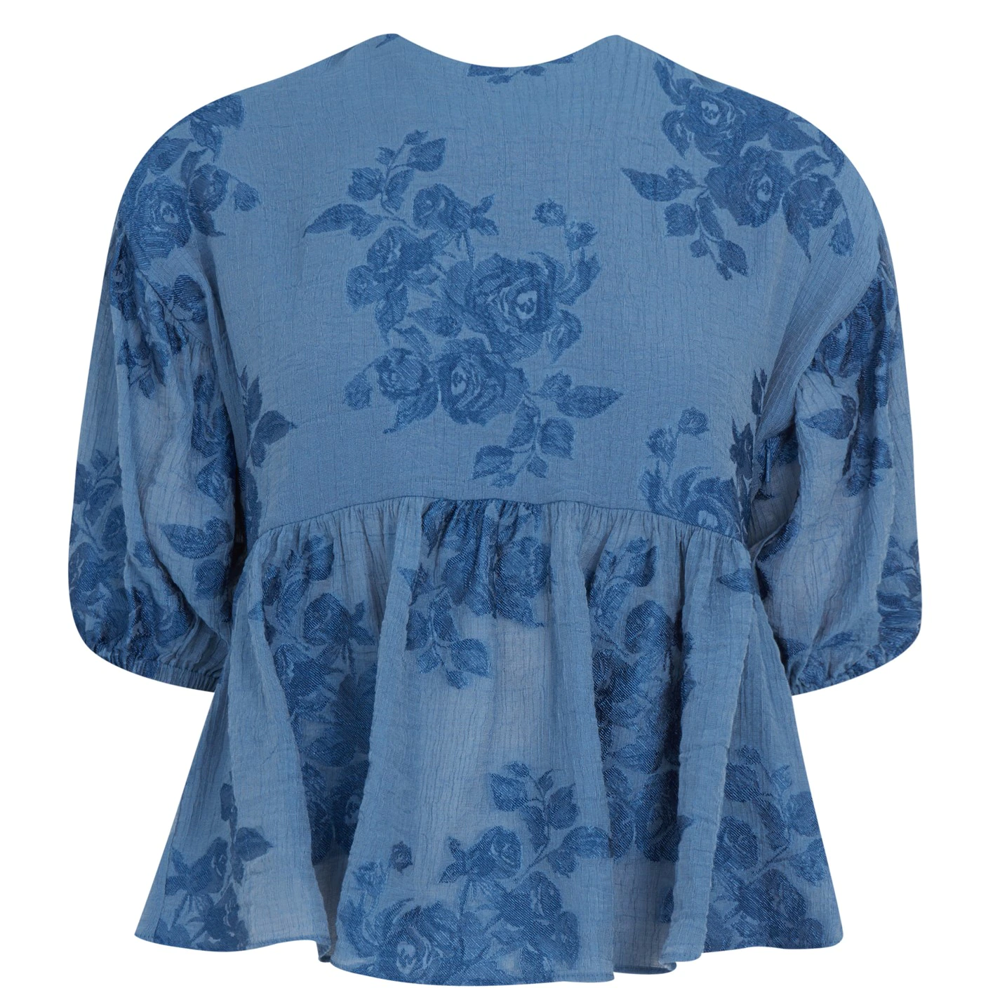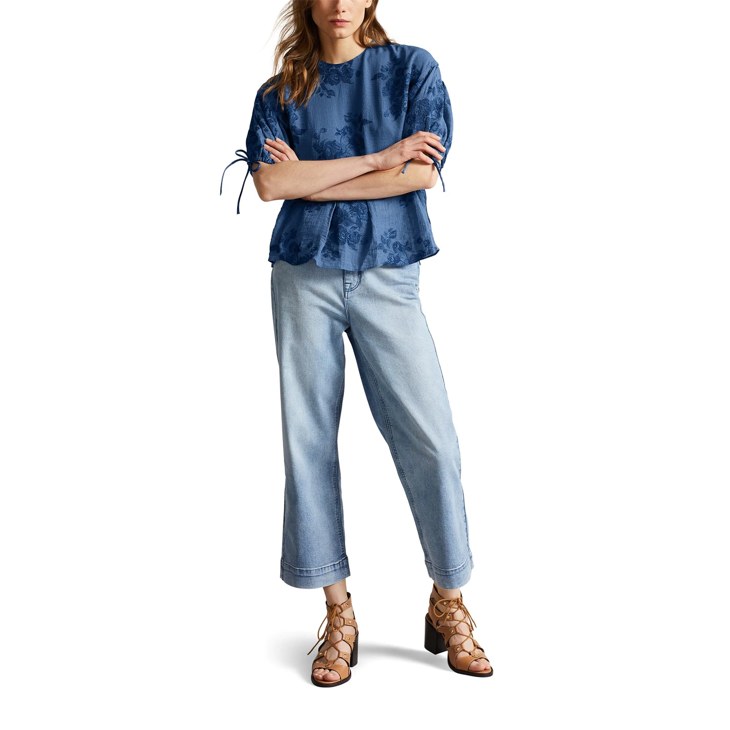 Refresh your casual wear with this Kaarin Blouse by Ted Baker, crafted in Turkey from viscose and polyamide blend for a super-lightweight design. Featuring a scoop neckline, elbow-length sleeves, elasticated, tie up cuffs and finished with gorgeous blue roses blossom on this sweet blouse, with a fluttery peplum hem and a delicate tie that crosses the open back.