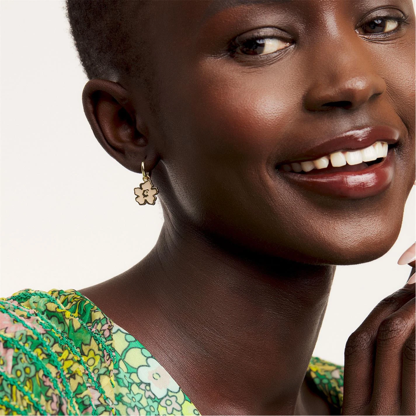 Ted Baker’s delicate LARLI huggie earrings have magnolia flower charms decorated with glistening gold tone plating and hand-applied pink enamel. Wear them alone or stacked next to sparkling studs.