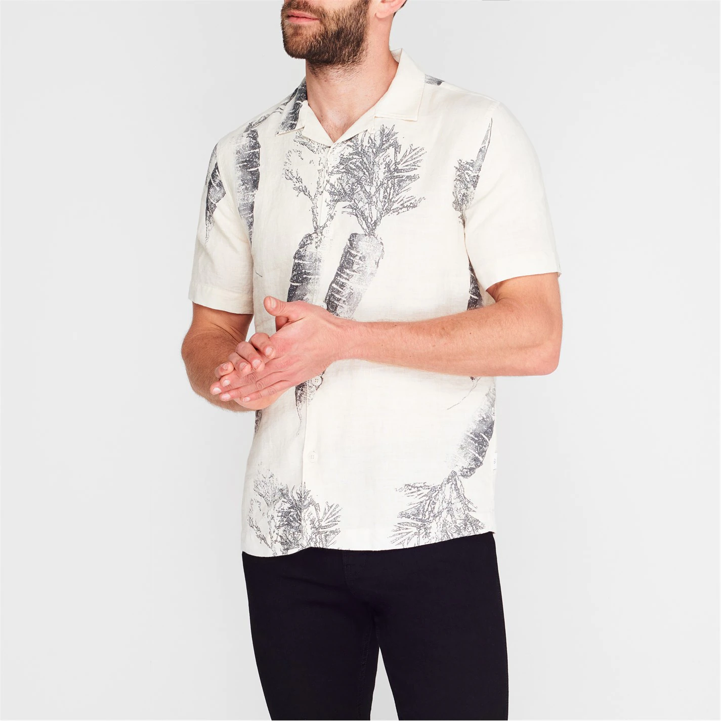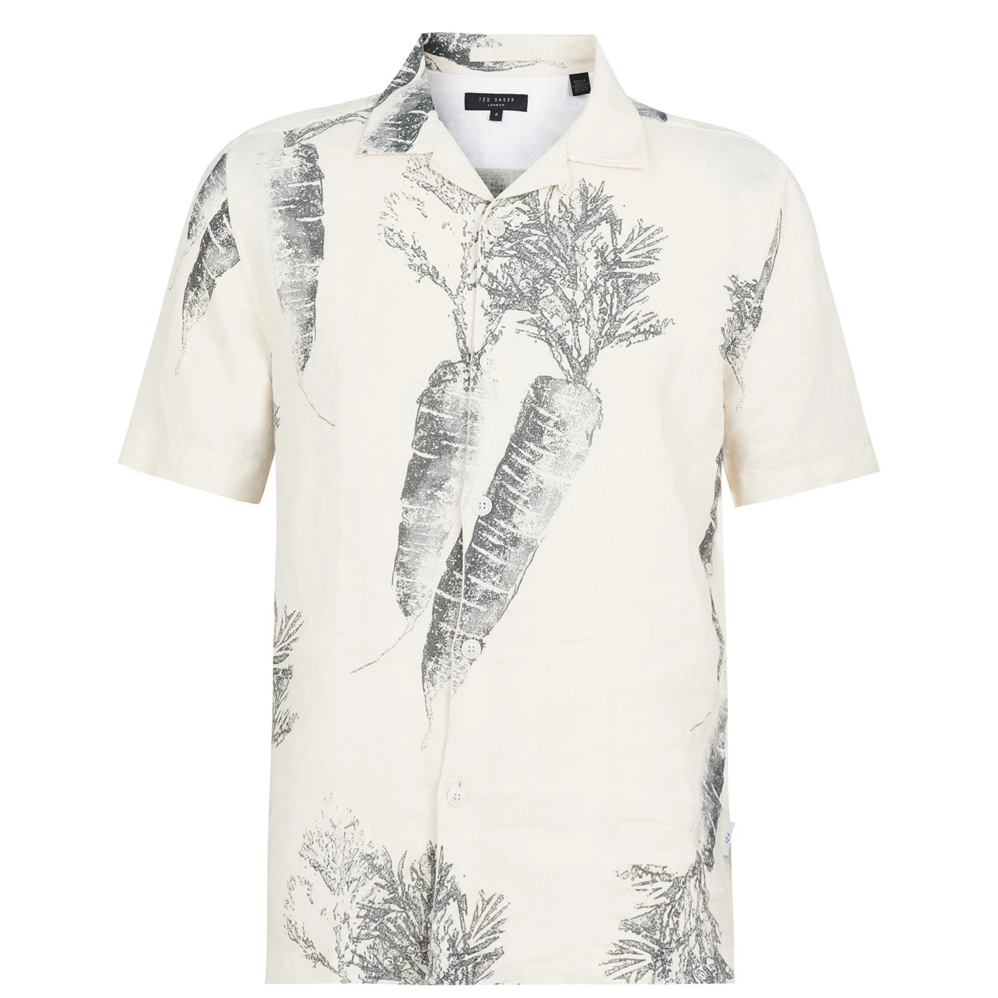 A staple addition ready for the summer, this Lenon Carrot Shirt by Ted Baker is crafted out of pure linen for a soft and breathable fit. The shirt features a lapel-style collar, full button fastening, short sleeves and split seams. The look is finished with an-over carrot graphic and and the Ted Baker signature logo tag embroidered on the side seam for subtle brand recognition and a high quality appeal.
