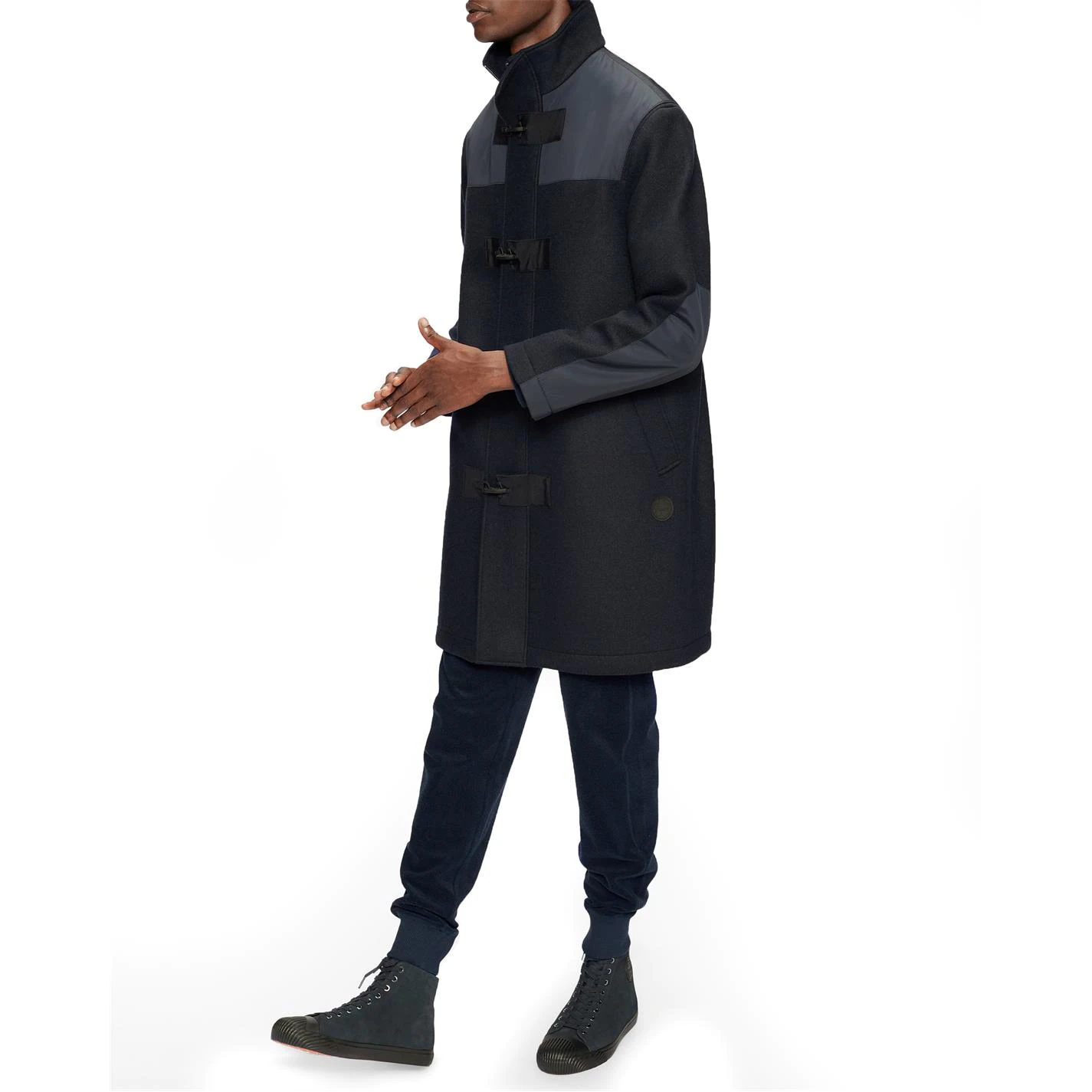 Revamp your outerwear with the Lens Duffle Coat by Ted Baker. Crafted in a brushed wool construction and boasting classic British influence, this jacket features a raised collar, a zip up front covered by a hook placket, side pockets and technical shell panelling to protect you from the elements. Finished with the Ted Baker branding for a premium look.