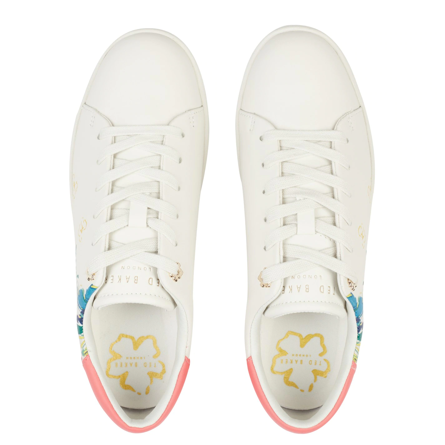 Add a feminine touch to a classic with these trainers from Ted Baker. Designed with a supple leather upper, this pair offers a contrasting heel counter for a pop of colour. Sat on a rubber sole with a lace up fastening, this pair is finished with multi-coloured flowers surrounding the back of the shoe for a summery touch.