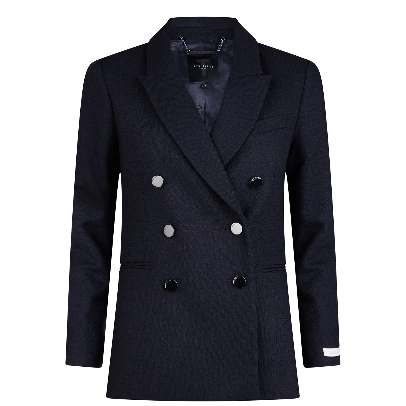 The Ted Baker Owain Blazer is a great addition to any formal wear wardrobe, featuring a double breasted design with button closure and notched lapel, two open pockets provide ample space for your essentials, a solid colouring along with the Ted Baker branding completes the smart and stylish look.