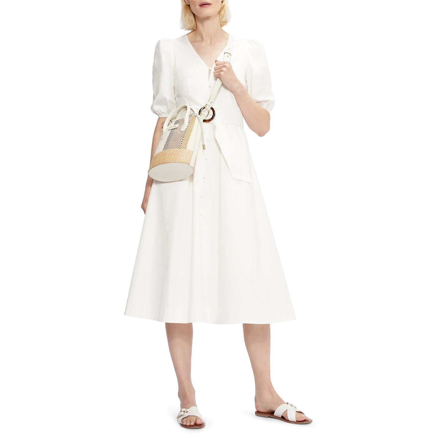 Update your collection with the Ted Baker Poppyy Midi Dress. Crafted from a cotton blend with a flattering v neckline and short puff sleeves, this midi dress will look super stylish paired with sandals and a matching crossbody bag. With the button front fastening offering a vintage touch, the design is complete with an adjustable waist belt and two side pockets.