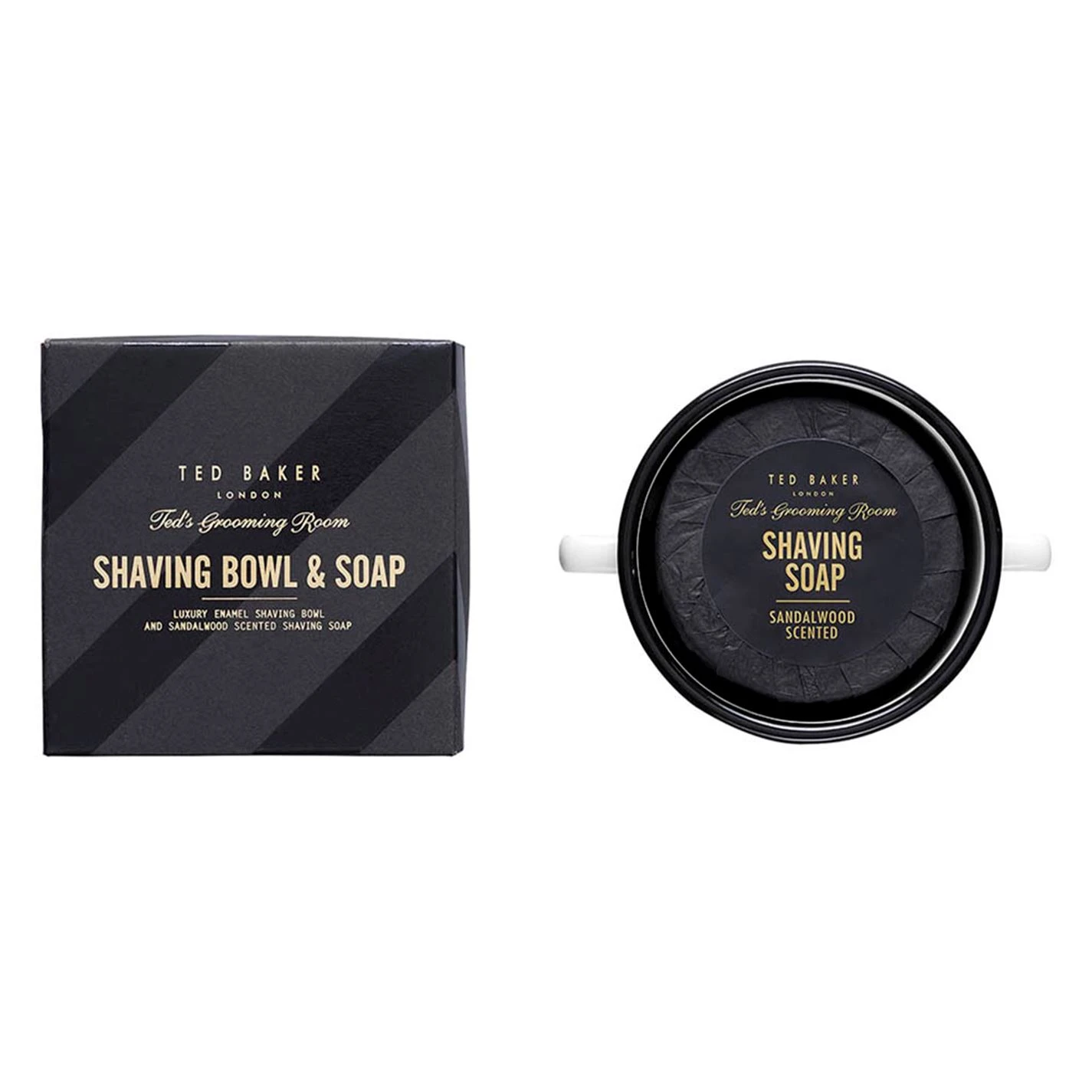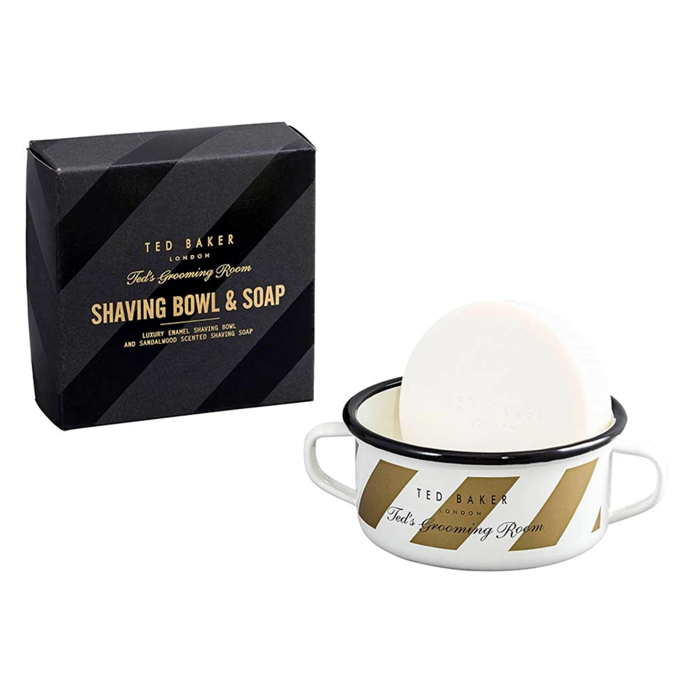 Discover the art of Turkish barbering with Ted’s Grooming Room Shaving Bowl & Soap Set. This barber shop essential has been elevated to Ted’s Grooming Room standards with luxurious sandalwood scented soap to create a rich lather. The soap sits in a sturdy enamel bowl featuring bold Ted Baker branding. Presented in a Grooming Room Branded Box.