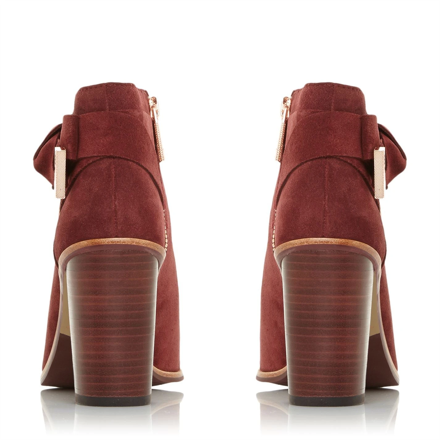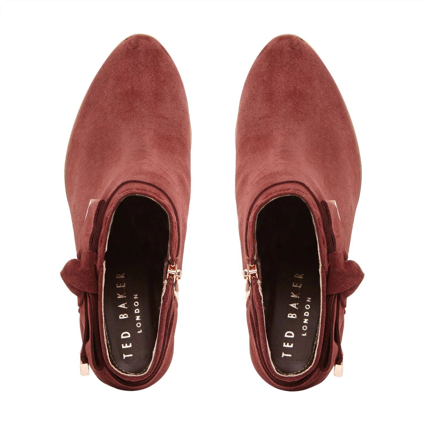 These Ted Baker Anaedi ankle boots are heeled and the height of fashion-forward styles. Designed with elegant pointed toe and bow detail with signature branding for a stamp of approval.