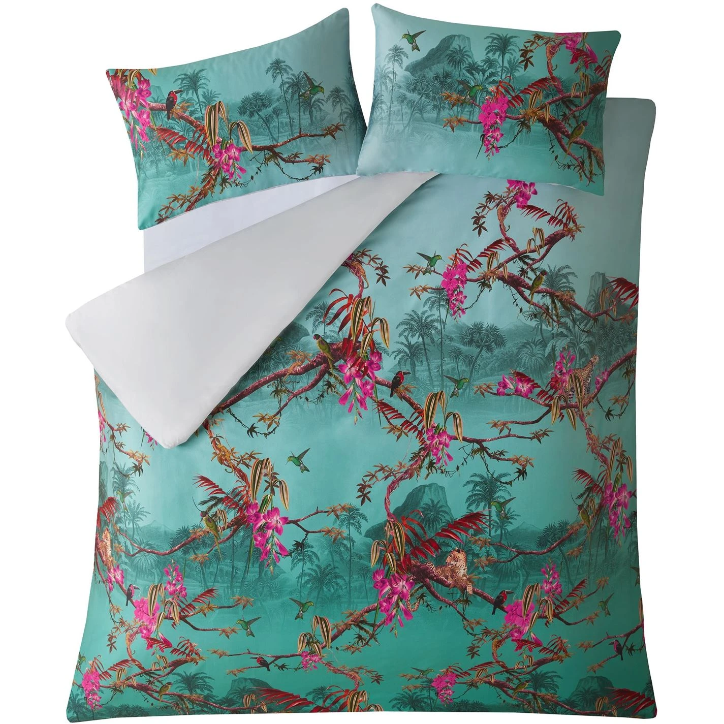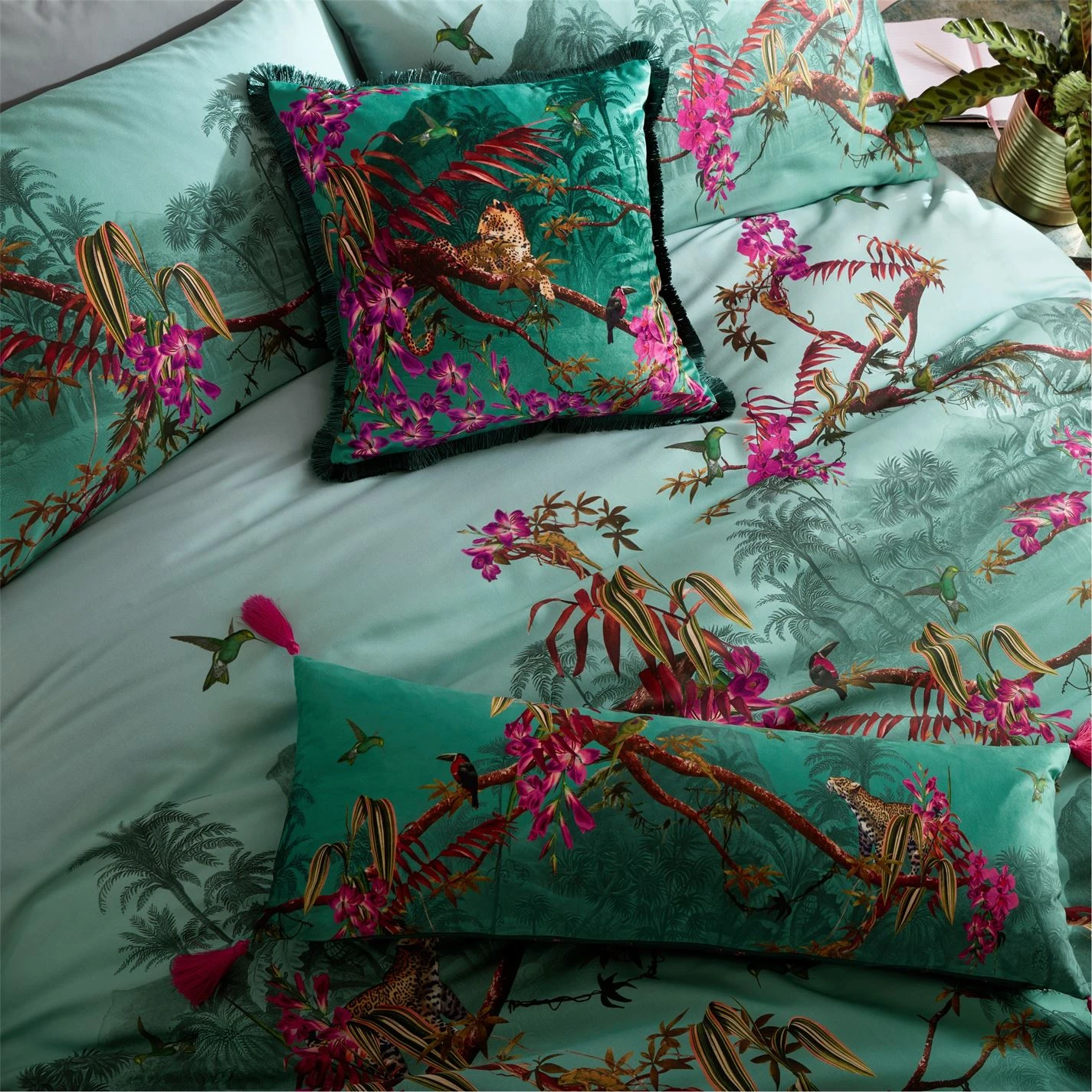 Drift away into dreams of an exotic jungle with Ted’s Hibiscus bedlinen. Hand painted birds fly amongst stunning hibiscus flowers and palm leaves whilst sleepy leopards snooze on branches. In a beautifully vibrant palette of vivid Jade and punchy Fuchsia on a soft cotton sateen. Add glamour with the matching accessories featuring elegant tassels and fringing detail. Matching Pillowcases available. Please note: The style you receive may vary from the image shown.