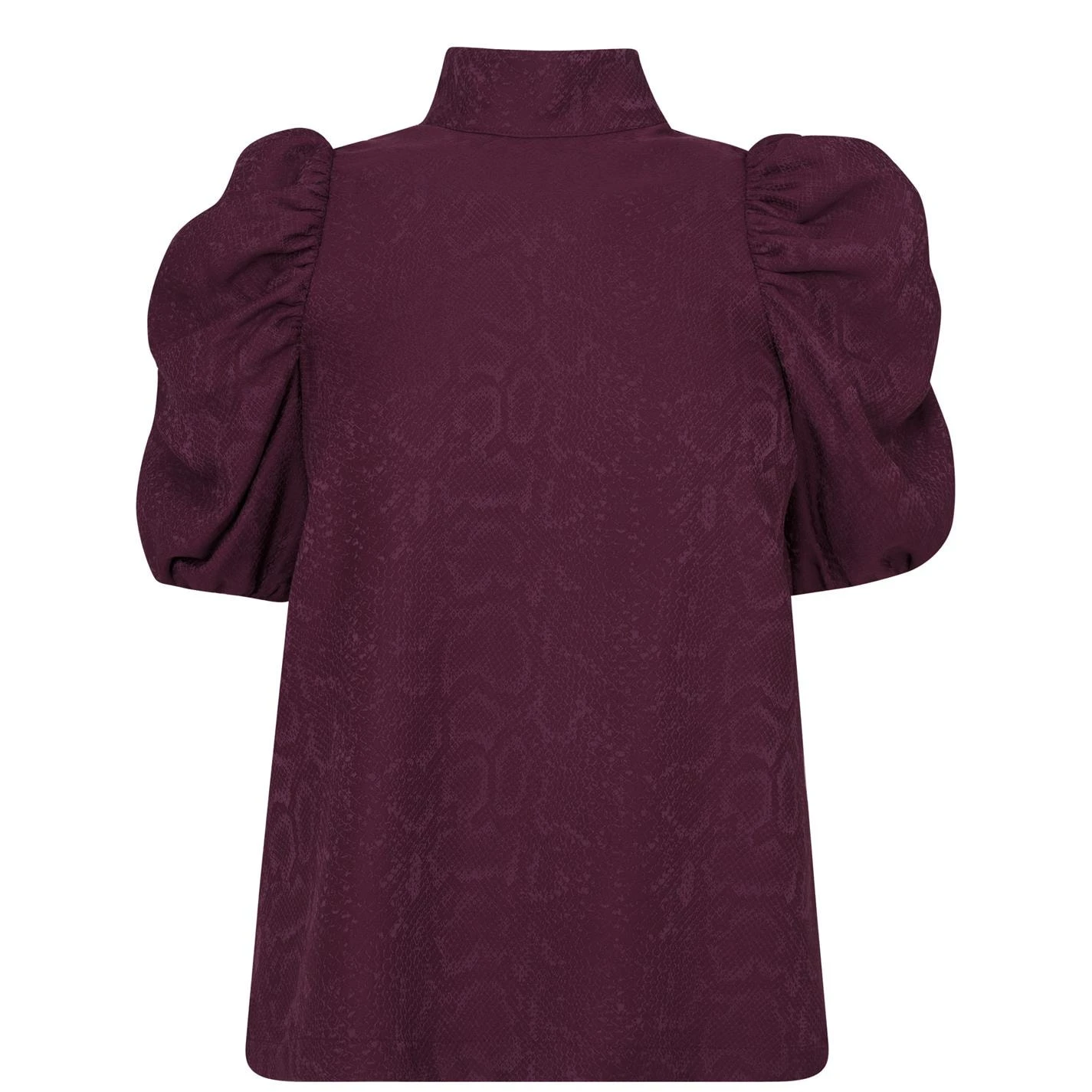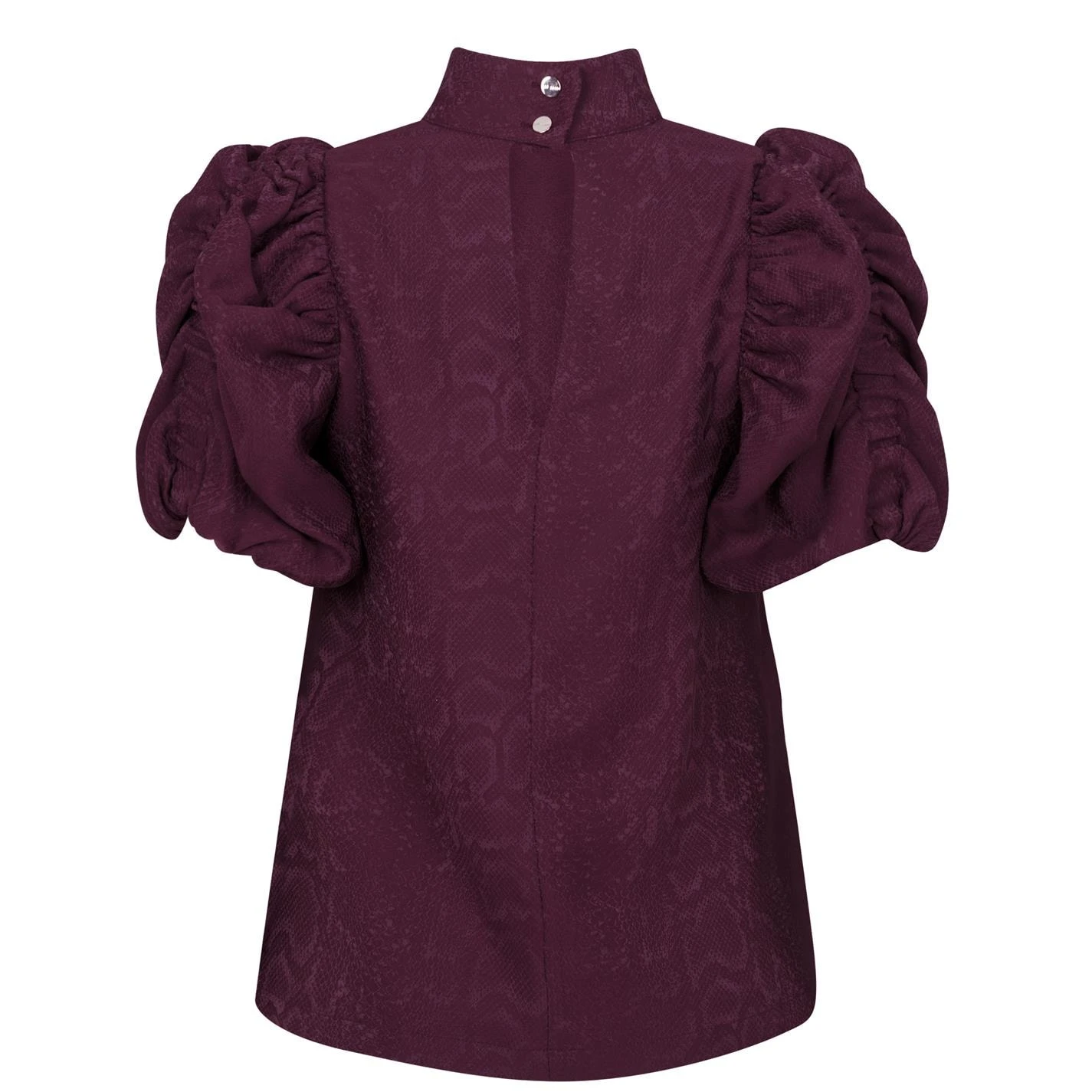 Finish your smart attire with this vintage yet on trend blouse from Ted Baker. Crafted from a mix of Viscose, Polyester and Elastane, the Kalmiia Blouse styles ruched puff sleeves, a key hole cut out back, high funnel neck and subtle snap print throughout. Dressed down with jeans or dressed up with a skirt and heels, the blouse is finished with simplistic Ted Baker branding engraved to the button.