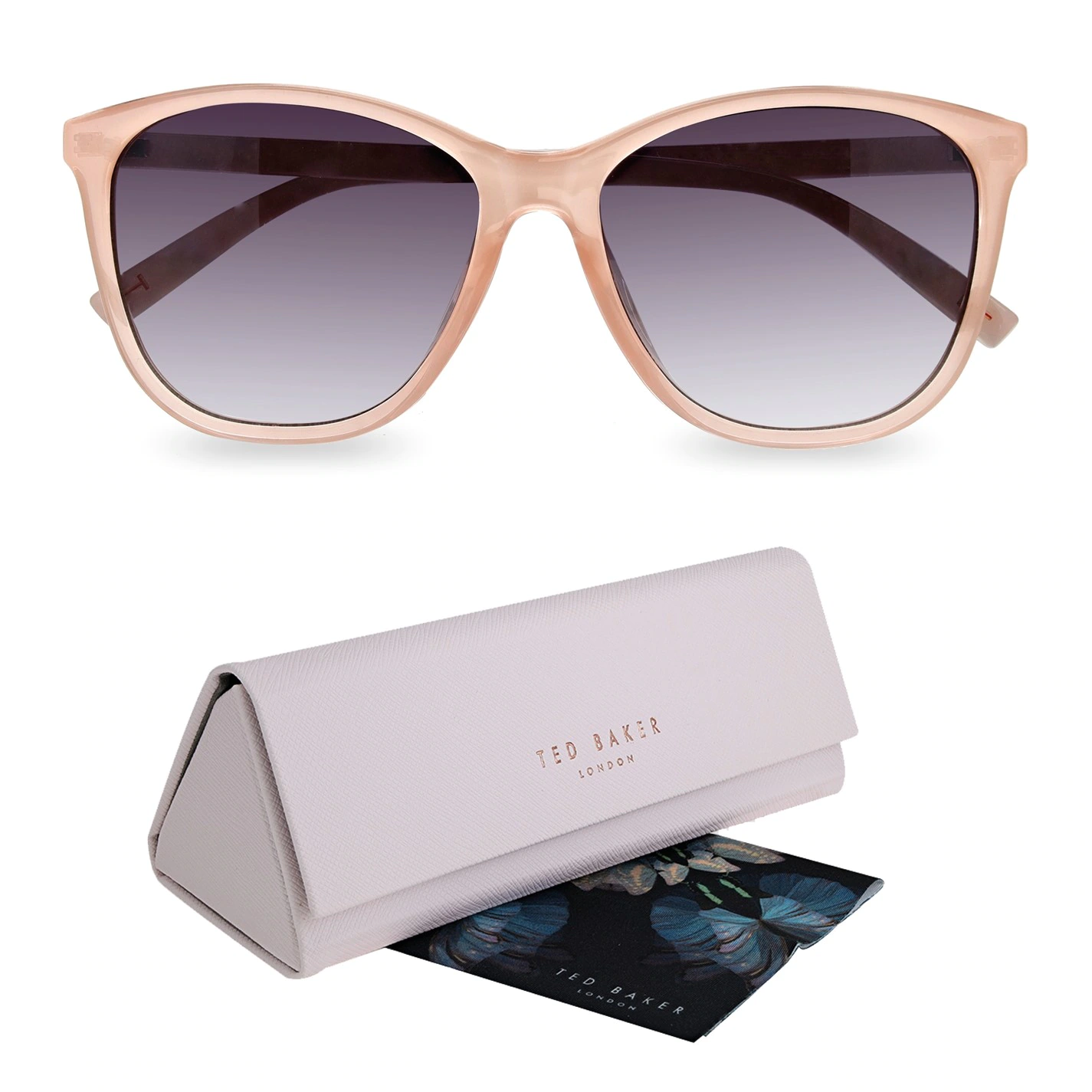 These classic Ted Baker ladies’ sunglasses are shown here in baby pink with a multi coloured Ted patterned temple