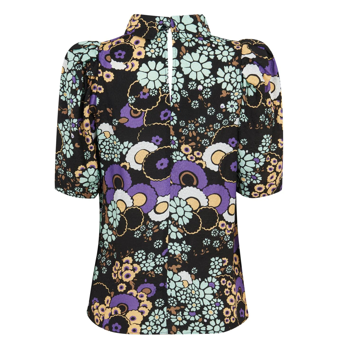 With it’s swinging sixties aesthetic the Yvonn Floral Top from Ted Baker is crafted from a super soft pure viscose construction, in a vibrant floral patterning that is sure to turn heads. In a short sleeve construction, exaggerated shoulders, classic collar and is complete with a keyhole back button fastening. Pair with a mini skirt and knee high boot to excel your vintage aesthetic.