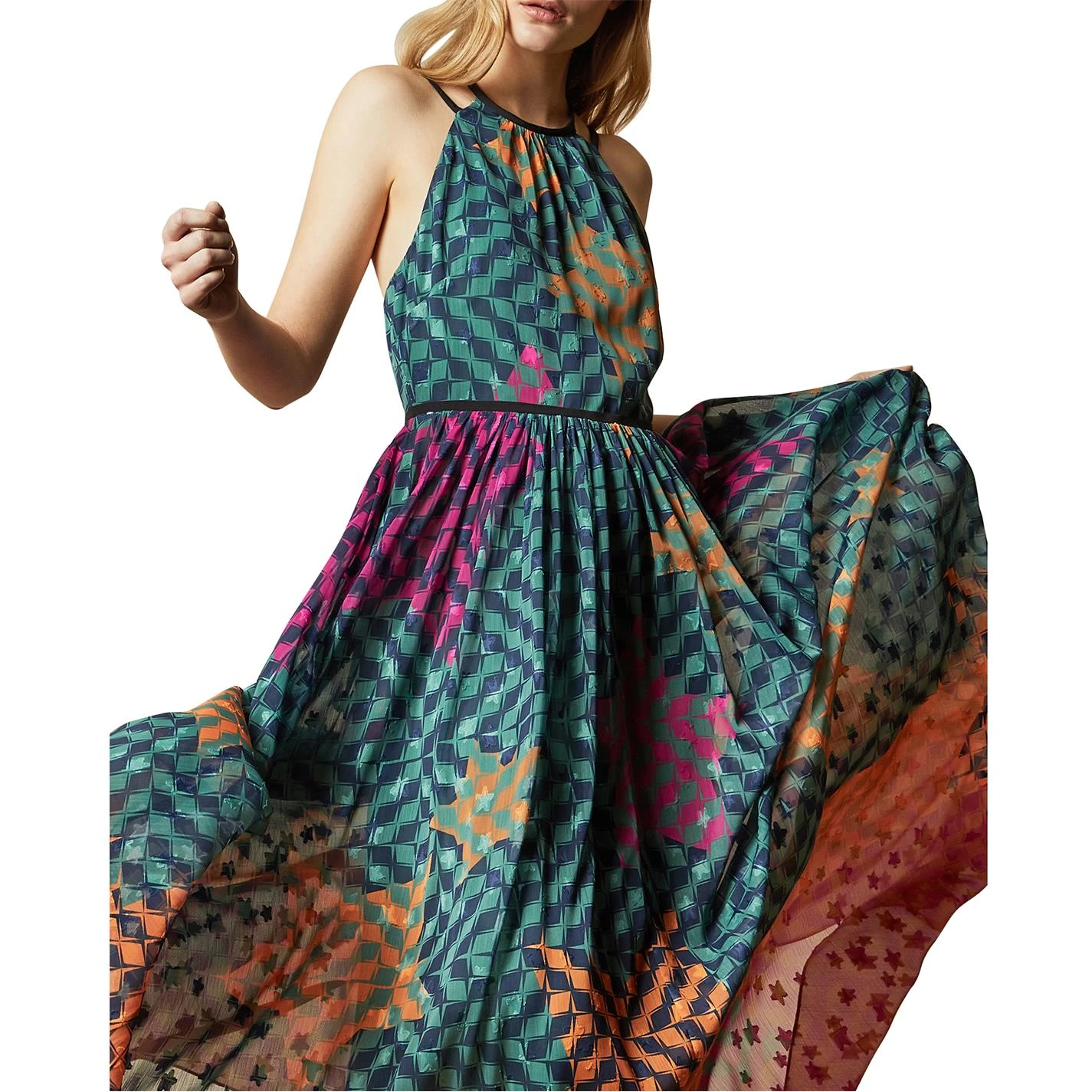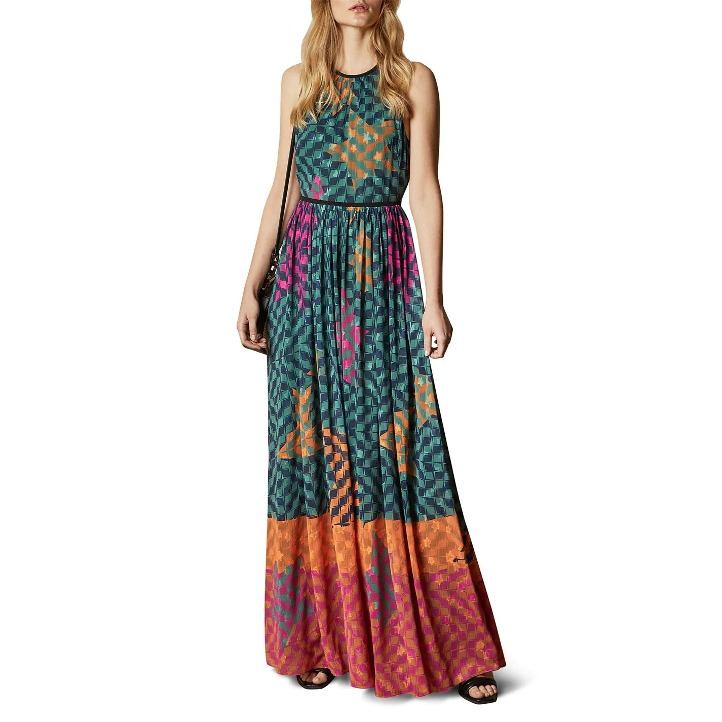 Add some colour to your Summer wardrobe with the Ted Baker Zhzoh Maxi Dress. The design features a high neckline and gathered waistline with the cami straps providing a stylish look. With the maxi length making this piece perfect for evenings out on holiday, the all-over colourful print completes the high quality aesthetic.